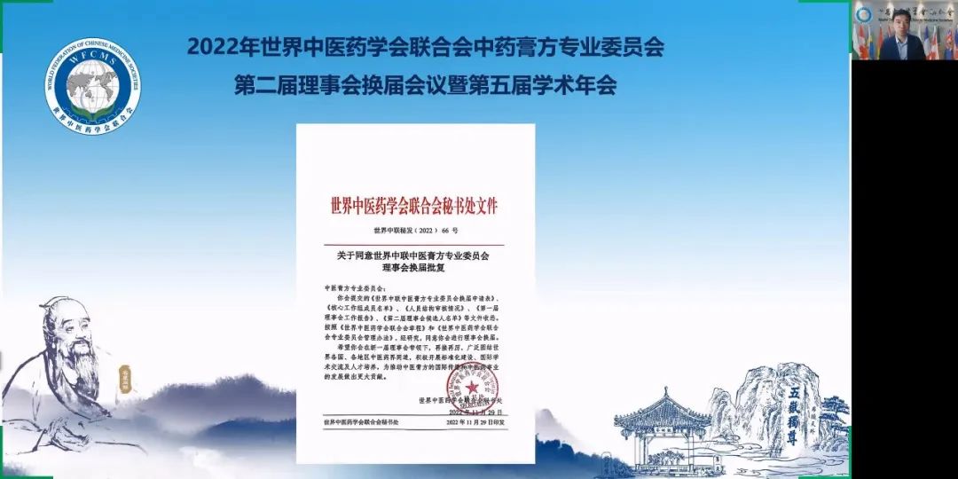 2022年12月4日上午,世界中醫(yī)藥學(xué)會(huì)聯(lián)合會(huì)(世界中聯(lián))中醫(yī)膏方專業(yè)委員會(huì)第二屆理事會(huì)換屆會(huì)議暨第五屆學(xué)術(shù)年會(huì)通過線上方式隆重召開。世界中聯(lián)主席馬建中向大會(huì)發(fā)來視頻致辭,學(xué)術(shù)部主任焦云洞代表世界中聯(lián)參加大會(huì),全國(guó)政協(xié)委員、首都名中醫(yī)、享受國(guó)務(wù)院政府特殊津貼專家、世界中聯(lián)中醫(yī)膏方專業(yè)委員會(huì)會(huì)長(zhǎng)、北京康益德中西醫(yī)結(jié)合肺科醫(yī)院董事長(zhǎng)兼院長(zhǎng)董瑞和顧問、副會(huì)長(zhǎng)、常務(wù)理事、理事及會(huì)員共335人參加了大會(huì)。其中來自匈牙利、葡萄牙、澳大利亞、俄羅斯、瑞典、波蘭、英國(guó)、美國(guó)、芬蘭、韓國(guó)、中國(guó)香港、中國(guó)澳門、中國(guó)臺(tái)灣等地的外籍專家學(xué)者65人。會(huì)議由第一屆理事會(huì)秘書長(zhǎng)秦洪義教授主持。