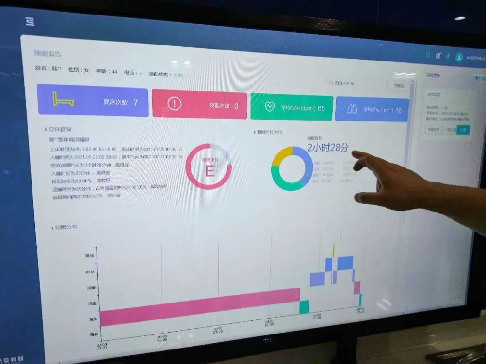 除了輸液外,患者的生命體征和運(yùn)動(dòng)軌跡也是醫(yī)護(hù)人員需要時(shí)刻操心的問(wèn)題。智慧病房搭建智能在床實(shí)時(shí)監(jiān)測(cè)系統(tǒng),在床墊下放置了傳感器,可以精準(zhǔn)測(cè)量和傳輸患者的生命體征、睡眠、離床等數(shù)據(jù),一旦數(shù)據(jù)異?;蛘呋颊唛L(zhǎng)時(shí)間不在監(jiān)測(cè)范圍內(nèi),系統(tǒng)會(huì)自動(dòng)進(jìn)行異常或離床、跌落等警報(bào),可以及時(shí)避免意外事件發(fā)生。
