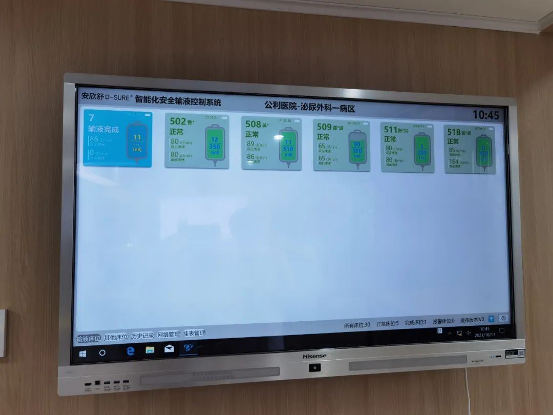 確定了用哪種輸液監(jiān)控技術(shù),變成“智慧輸液”卻還需要一個(gè)信息化工程,這就是信息護(hù)士產(chǎn)生的原因。以智慧輸液為例,要讓輸液信息“跑”起來(lái),就要一張“網(wǎng)”——具象地看就是智慧病房的7個(gè)屏:病床有兩個(gè)屏,大屏功能很多,不但可以看視頻、叫護(hù)士……還可以完成出院結(jié)算;小屏就是以前床頭的“小白卡”,顯示患者姓名、護(hù)理級(jí)別等。護(hù)士站有三個(gè)屏,一個(gè)大屏是輸液控制屏,顯示全病區(qū)的輸液情況;另外一個(gè)大屏相當(dāng)于寫(xiě)字板,就是護(hù)士站常見(jiàn)的手寫(xiě)黑板的“升級(jí)版”,除了即時(shí)更新醫(yī)囑外,還可以在病房看到正在做的手術(shù)情況等;此外還有護(hù)士站管理屏。再加上走廊屏、房間屏,所有的信息一次輸入、全程“跑動(dòng)”。